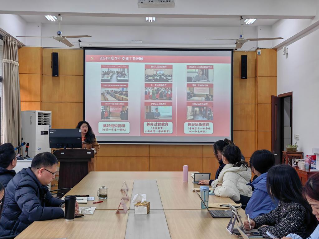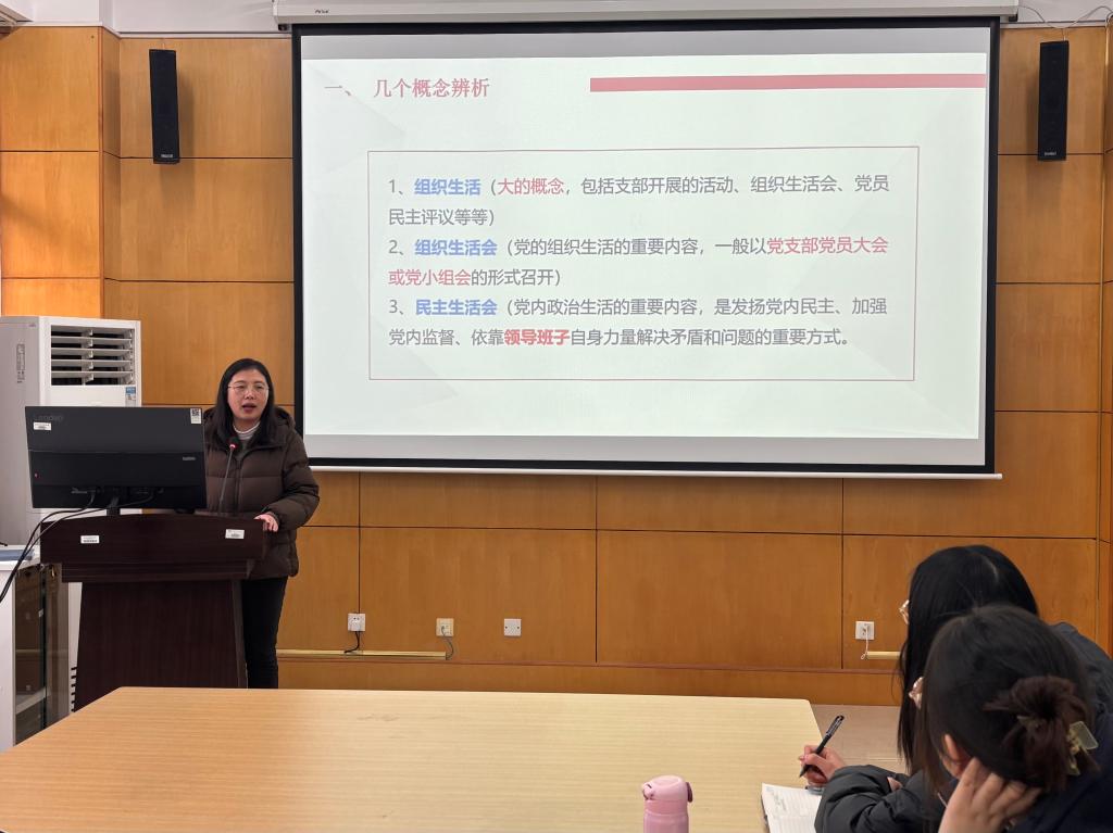 陆芳布置2024年度基层党支部组织生活会与民主评议党员工作事项。她带领全体成员学习学校有关文件精神,从会前准备、会议流程、会后总结等方面进行细致解读;并强调要严格按照既定程序,精心筹备各个环节,规范开展好理论学习、征求意见、谈心谈话、查摆问题等工作,确保2024年度组织生活会和民主评议党员工作从严从实、规范有序开展。缪晶晶汇报2024年法学院学生党建工作情况,坚持抓好组织管理、过程教育与队伍建设,打造“行走的红色思政”党建工作品牌,在学生党员培育、组织生活质量提升、党员先锋模范作用等方面取得系列成果,助力学院事业发展。同时,对新学期学生党建重点工作与智慧党建系统使用规范进行详细介绍。