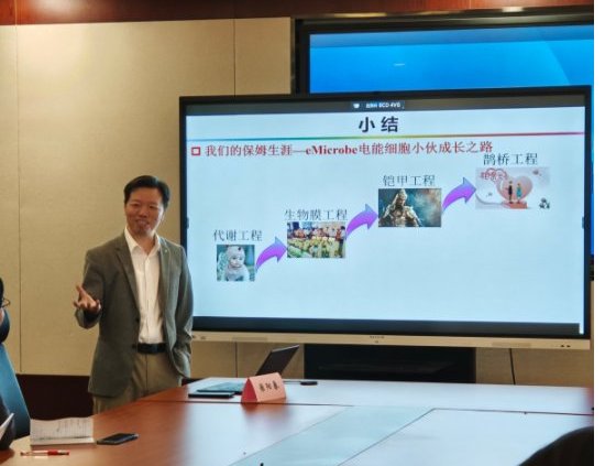 讲座中,雍阳春教授深入浅出,针对细胞跨膜电子效率低与电极表面天然生物膜生物量负载较低的瓶颈问题,介绍了团队在希瓦氏菌调控生物膜形成与种间电子传递过程中的最新科学进展。采用聚苯胺涂层的三维石墨烯作为阳极,解决了传统微生物燃料电池细菌负载量与跨膜电子传递效率低的问题,显著提升了功率输出。在此基础上,结合希瓦氏菌原位还原石墨烯过程,形成了三维大孔导电生物膜,阳极氧化与阴极还原电流密度得到显著提升。从多细胞生物膜控制到杂合单细胞工程,阐述了希瓦氏菌在生物膜形成与种间电子传递过程中的重要作用。重点介绍了“单细胞电子收集器”在电子跨膜运输过程中的优势,相较于传统电极,该设计通过全表面覆盖的结构,降低了接触距离,达到了纳米级紧密接触,并形成了多重传导通路,丰富了电子传导路径。针对如今污染物资源化再利用的新趋势,从细胞跨膜电子传递角度出发,为未来进一步优化微生物燃料电池性能提供了新的可能性。