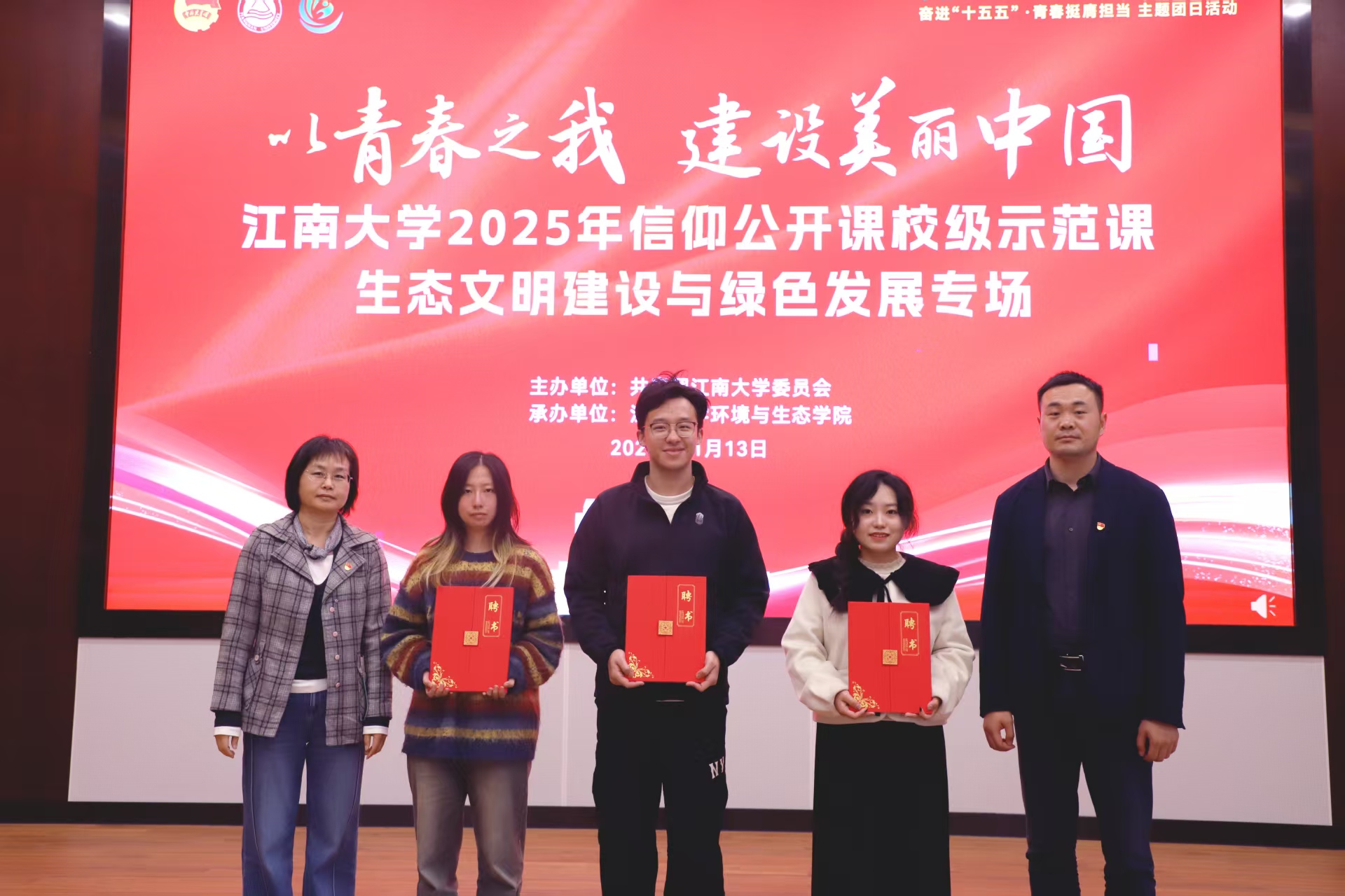 本次“以青春之我建设美丽中国”信仰公开课,紧扣党的二十届四中全会关于美丽中国建设的部署要求,以三维宣讲模式搭建理论与实践的桥梁。校友的环保产业探索、学子的生态志愿故事、理论宣讲员的思想阐释,层层递进诠释了生态文明建设的实践路径。聘书颁发仪式进一步壮大青年宣讲力量,让全会精神通过“青春话语”落地生根。活动既展现了青年将专业所长融入生态强国建设的担当,也为学习贯彻全会精神、奋进“十五五”凝聚了青春动能,推动绿色发展理念在青年群体中入脑入心。