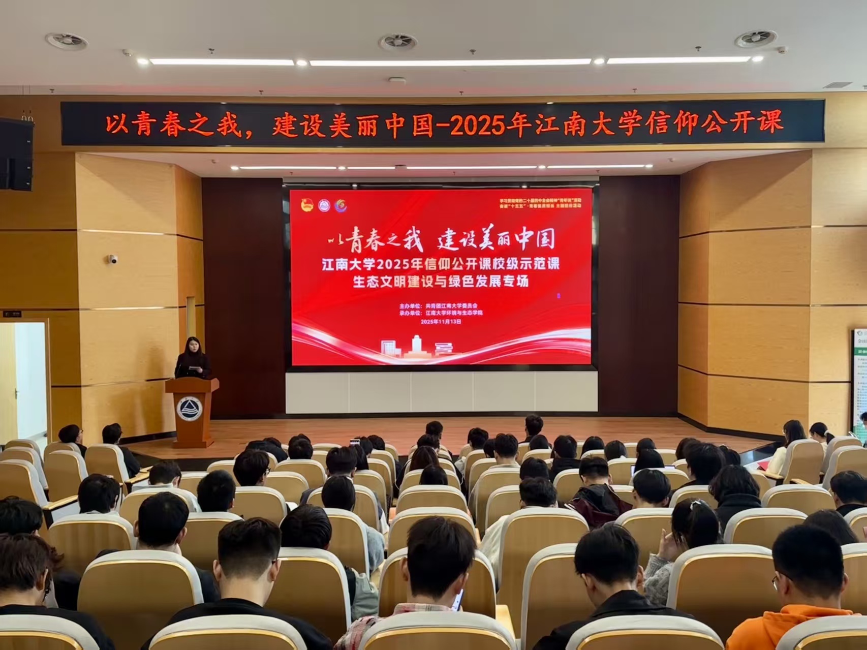 11月13日下午,“以青春之我建设美丽中国”信仰公开课校级示范课——生态文明建设与绿色发展专场在东氿校区清源楼A101报告厅举办。本次活动同步开展学习贯彻党的二十届四中全会精神“青年说”、奋进“十五五”・青春挺膺担当主题团日活动,环境与生态学院党委书记李艳、校团委副书记吴垚出席活动,各学院师生代表共计200余人参加。活动由李翰林主持。