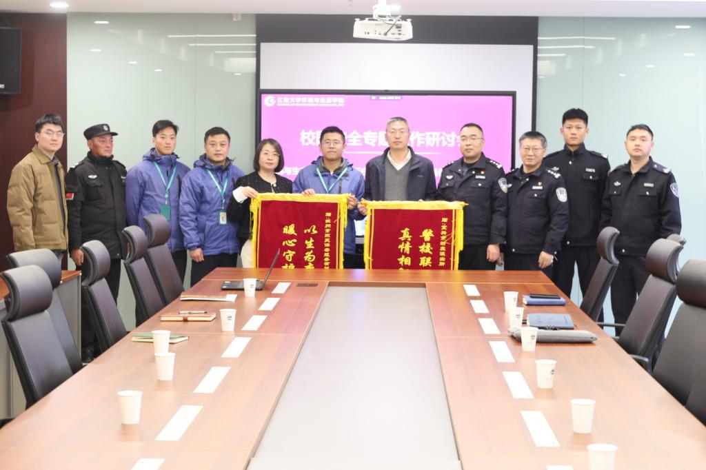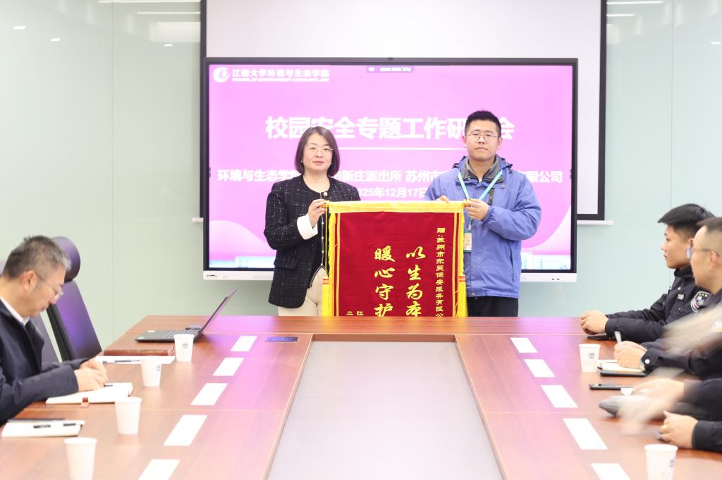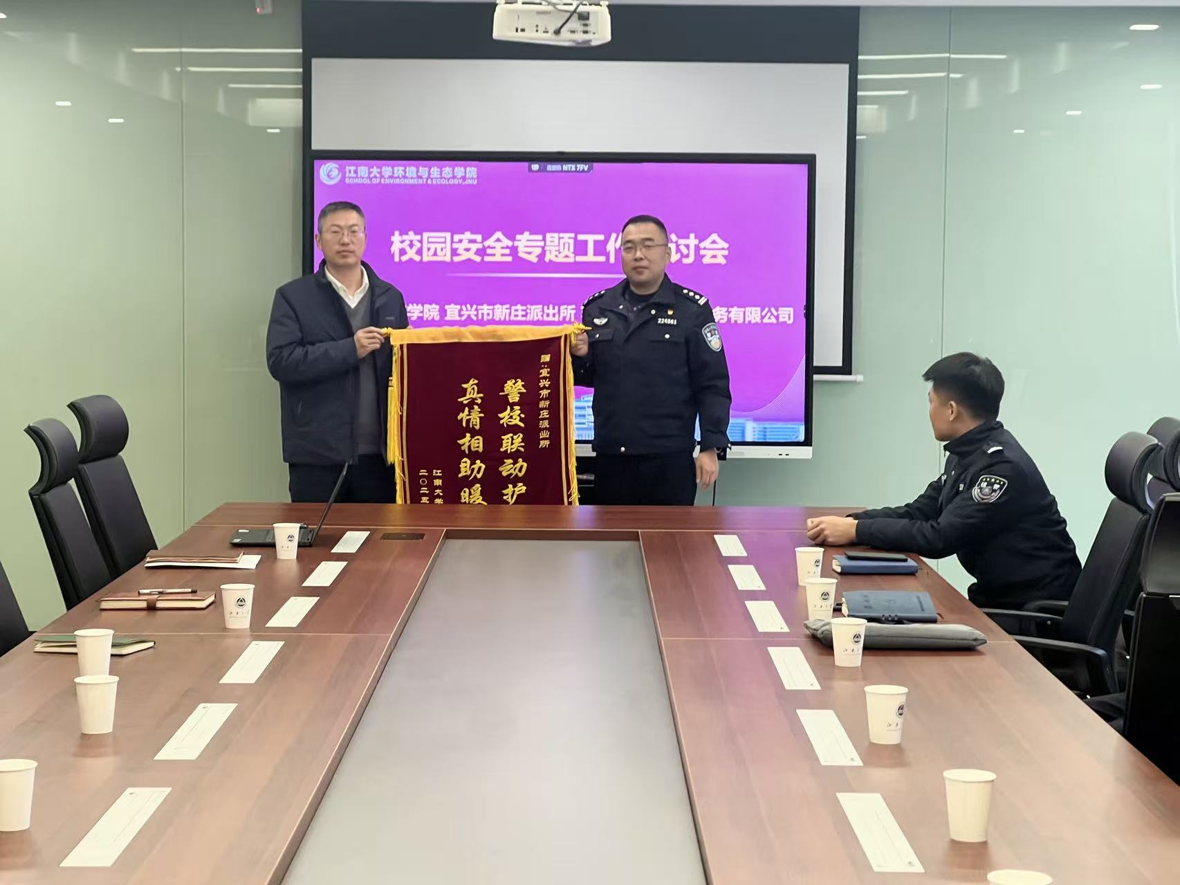 为深化校地警校联动,筑牢校园安全屏障,并感谢相关单位长期以来对学院安全工作的大力支持,12月17日,环境与生态学院在东氿校区钱盘生楼A210开展校园安全专题工作研讨会。宜兴市新庄派出所孙福平一行,苏州市东吴保安服务有限公司吴伟彬一行,学院党委书记杨延,党委副书记、副院长胡娟,以及师生代表共同出席。活动由辅导员李东辉主持。
