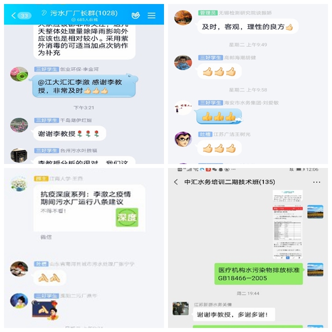 抗击疫情,人人有责。环境与土木工程学院教师以身作则,始终牢记初心使命,发挥专业优势指导疫情期间污水厂、排水公司等的正常安全运行,用实际行动抗击疫情。李激教授的专业建议在国内排水行业群中也受到了好评。