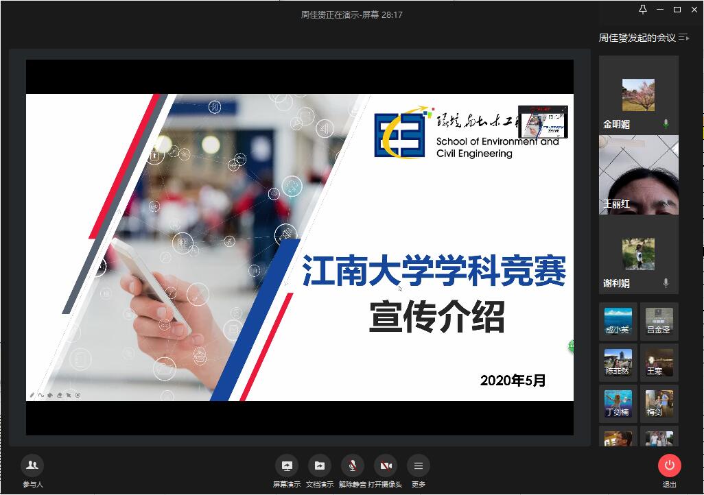 为进一步推进环境与土木工程学院学科竞赛工作,激发教师参与大学生学科竞赛指导工作的积极性,2020年5月13日下午,环土学院利用企业微信平台召开2020年学科竞赛推进会。院党委副书记兼副院长金明媚、学院学工办主任蒋达锋、学院各科研团队教师代表参加会议。辅导员周佳赟主持会议。