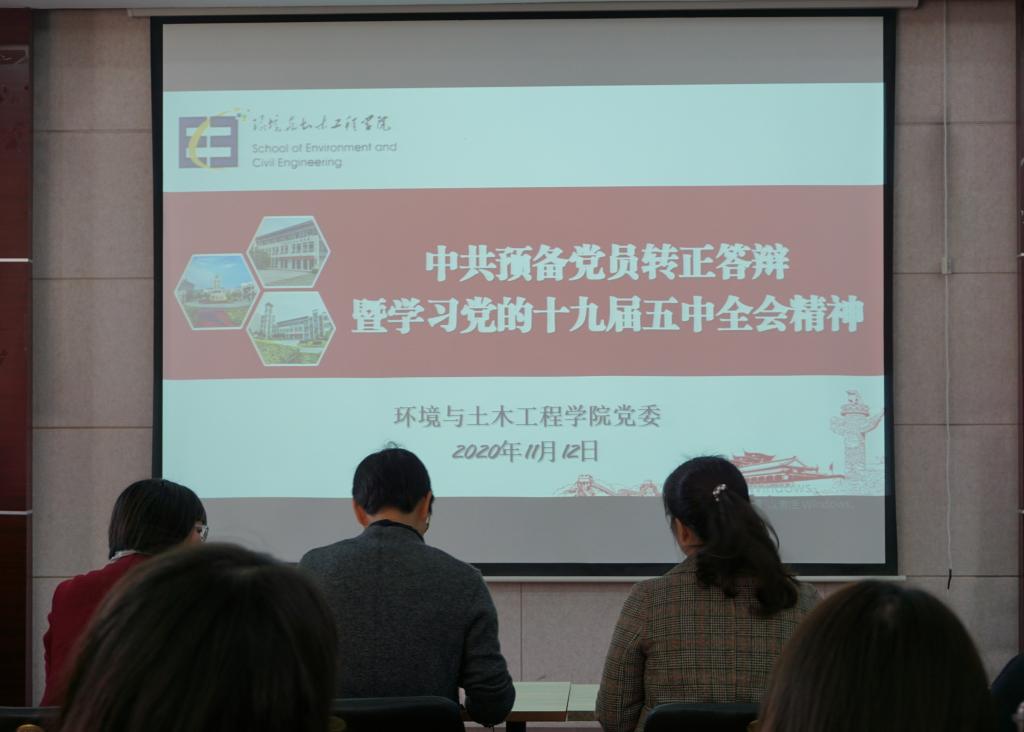 为进一步完善学生预备党员考察机制,切实发挥学生党员先锋模范作用,深入学习党的十九届五中全会精神,11月13日下午,环境与土木工程学院举行本学期预备党员转正答辩会暨学习党的十九届五中全会精神。院党委书记李艳,副书记胡娟,院党委秘书沈炎,辅导员周佳赟、薛羚伟、何涛、邵冰洁、周盼盼担任答辩评委,学生党员叶好焰主持会议,下半年拟转正预备党员参加会议,各支部其他党员、部分入党积极分子列席会议。