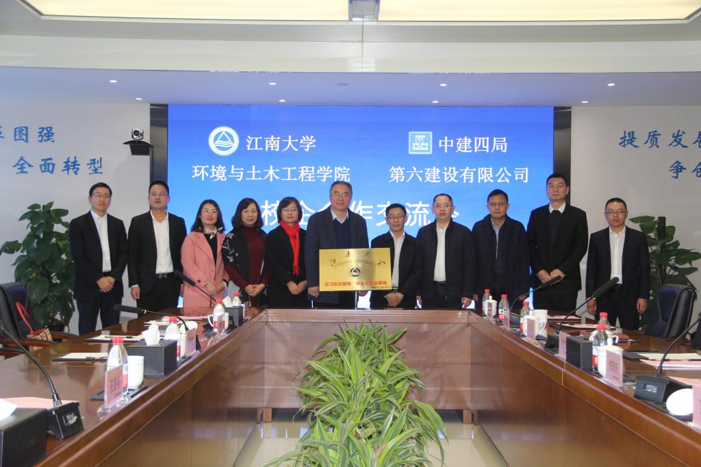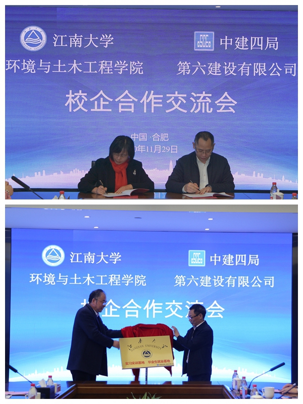 11月29日下午,环境与土木工程学院-中建四局第六建设有限公司校企合作签约仪式在公司总部合肥中建大厦举行。中建四局第六建设有限公司党委副书记、工会主席徐玉发,党委委员、董事、总会计师郑国庆,党委委员、董事、总经济师曹延强,党委委员、董事、安徽分公司党委书记、总经理丁云朝,人力资源部经理李侠,上海分公司党总支副书记、工会主席车其杰,上海分公司人力资源部经理陆强,江南大学校长助理张光生,环境与土木工程学院党委书记李艳,招生就业处副处长张婕英,环境与土木工程学院党委副书记、副院长胡娟等参加了签约仪式。