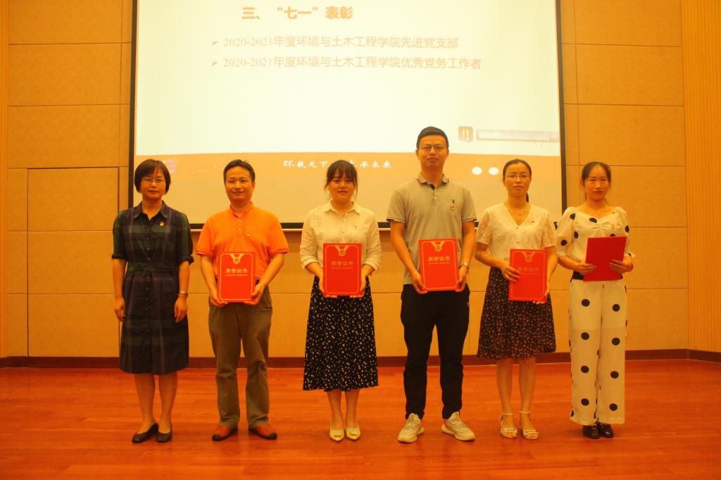 活动在《奋斗百年路 启航新征程》的铿锵诵读声中开始。由各支部党员代表组成的朗诵小组,声情并茂,带着全体与会党员,从红船出发,开启新时代的向往,加冕祖国建设的荣耀,感受着党一路带领人民创新突破,建功立业。随后在院长王震宇的带领下进行了新党员入党宣誓、党员重温入党誓词仪式。新党员代表2019级环境科学硕士研究生唐洁雨、毕业生党员代表林欣怡同志先后发言。她们表示将从党的百年奋斗中汲取前行力量,以昂扬奋斗姿态,在今后的学习工作中、在平凡的岗位上发光发热。院党委书记李艳宣读了2020-2021年度学院优秀共产党员、优秀党务工作者和先进党支部的表彰决定。院领导为16位优秀党员、5位先进党务工作者和5个先进支部颁发了荣誉证书。同时,对最佳党日活动申报支部和“对话百年,写给先辈的一封信”征文活动优秀组织支部进行了奖励。最后,院分工会合唱团深情演唱了《我和我的祖国》,把最美的祝福送给党,把深深的感恩献给祖国。