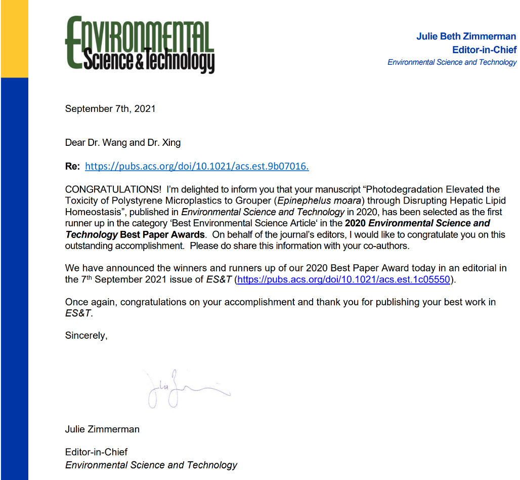 近日,环境领域国际顶级期刊 Environmental Science and Technology(ES&T) 公布了该期刊2020年度的13篇“最佳论文”(ES&T's Best Papers of 2020)名单。由中国海洋大学博士后王潇、郑浩副教授为共同第一作者,江南大学环境与土木工程学院王震宇教授和美国麻省大学安姆斯特分校Baoshan Xing(邢宝山)教授为共同通讯作者,于2020年3月24日在ES&T发表的封面论文“Photodegradation Elevated the Toxicity of Polystyrene Microplastics to Grouper (Epinephelus moara) through Disrupting Hepatic Lipid Homeostasis”,荣获2020年度最佳论文奖(环境科学类第2名,共4项)。研究团队聚焦于全球高度关注的微塑料污染的热点生态环境问题,揭示了聚苯乙微塑料光降解的途径和机制,定量评估了光降解产物纳米塑料颗粒和内源化学污染物的产率;从生理代谢、细胞毒性和基因调控方面阐明了光降解的聚苯乙烯微塑料对海洋生物云纹石斑鱼的肝脏毒性机制。该研究首次揭示了微塑料光降解行为对其生物毒性效应的调控机制,加深了对环境自然老化过程中微塑料的环境行为和生态风险影响的科学认识,为微塑料的生态风险评估提供了重要的理论依据。