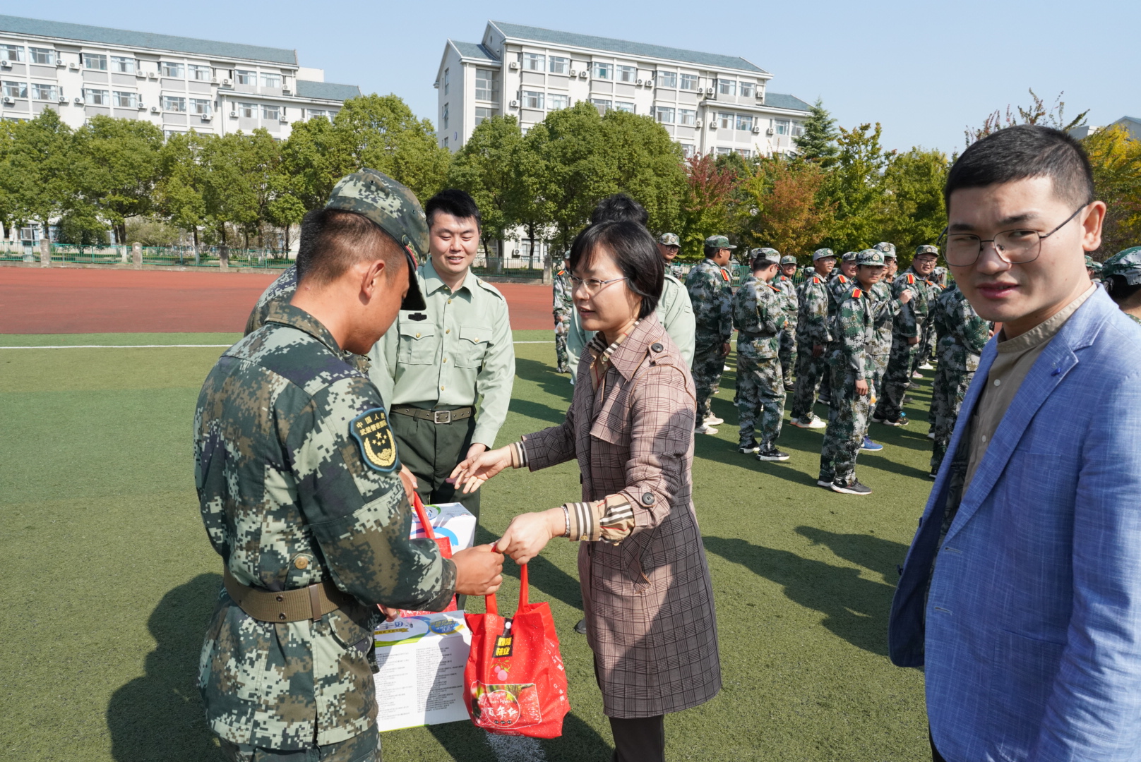 活动最后,各位领导与教官和同学们进行了亲切的交流,并送上了慰问品,传达学院老师对教官们的感谢和对同学们的关心。