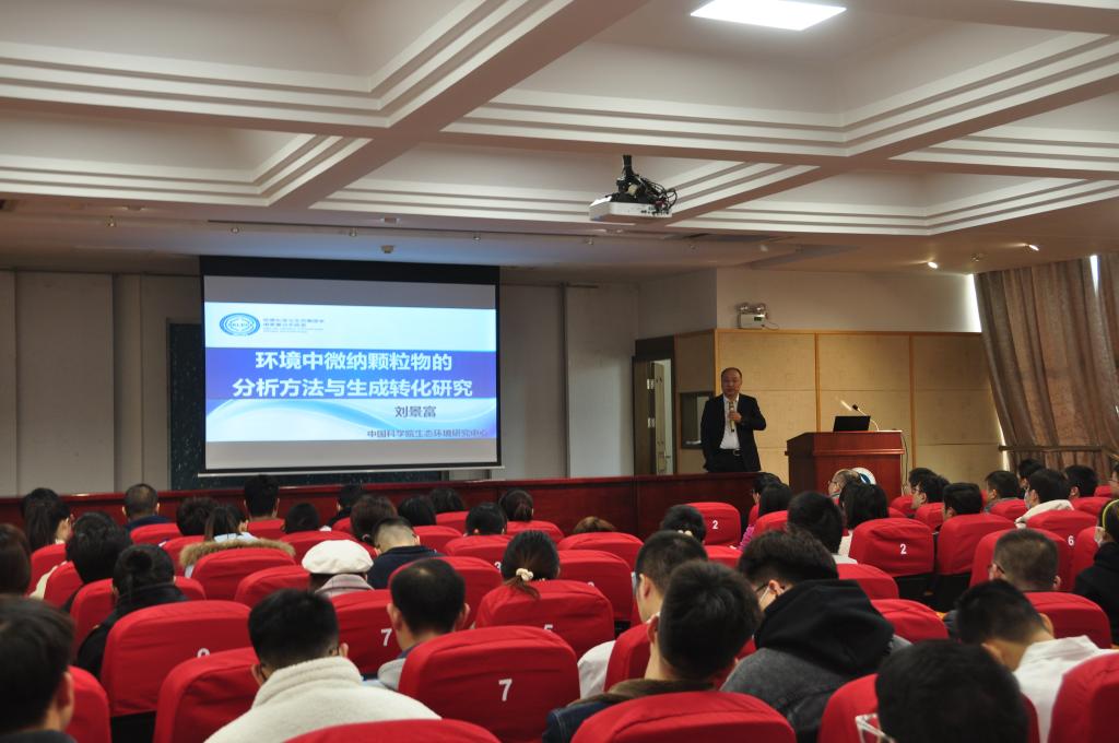 本次论坛邀请了中国科学院生态环境研究中心刘景富研究员、中国海洋大学赵建教授和中国科学院沈阳应用生态研究所赵青研究员等三位国家级人才作为主讲嘉宾。首先,刘景富以“环境中微纳颗粒物的分析方法及生成转化研究”为题,系统地分享了他近年来在水环境中微纳米颗粒的检测方法以及微纳米颗粒生物转化方面的研究进展。随后,赵建围绕“典型纳米颗粒的水环境效应”,探讨了水环境中不同类型的石墨烯的生物毒性机制。最后,赵青围绕二维黑磷环境行为及其潜在应用方面,详细讲述了纳米黑磷在水体有机污染物、病原菌等的去除机理和潜在应用前景。报告结束后,三位专家与在场师生进行了热烈的学术讨论。
