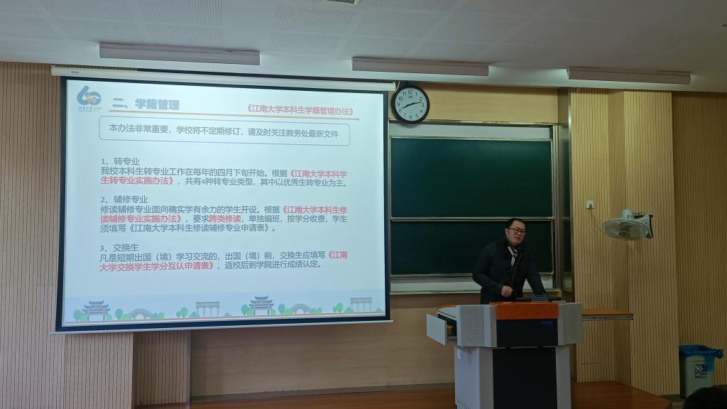 王硕首先讲解了21级新生的人才培养方案,对学生大学四年的应修学分、课程性质、课程开设学期等内容进行了详解。然后,王硕结合学籍管理的典型案例,对学籍注册、课程考核、考试纪律、降级、休学与复学、退学、毕业与结业等方面作了详尽的阐述。最后,王硕老师对江南大学转专业政策进行了讲解,让同学们首先想清楚自己为什么想转专业,转专业需要做哪些准备,转专业后需要承担哪些后果。王硕认为全体新生需尽快在学习方法、生活方式、处事原则等方面进行角色调整,适应新环境、融入新氛围、投入新生活,为实现梦想而刻苦学习、奋力拼搏。