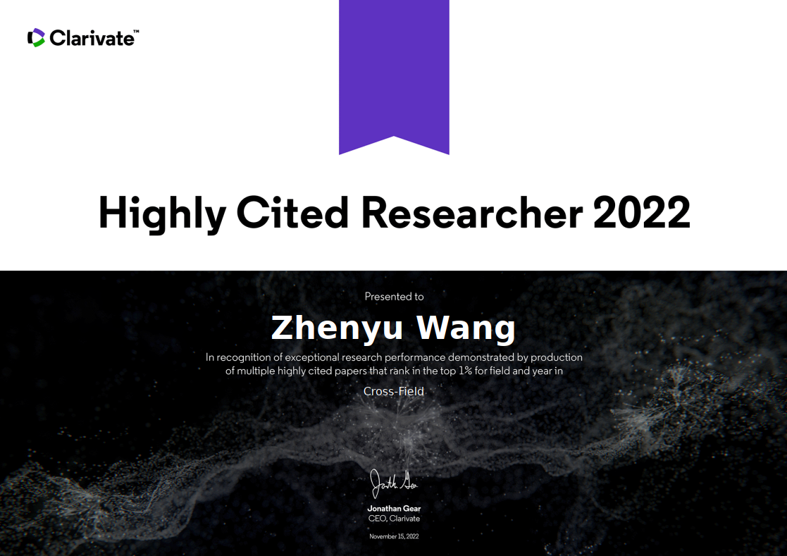 科睿唯安全球“高被引科学家”荣誉证书