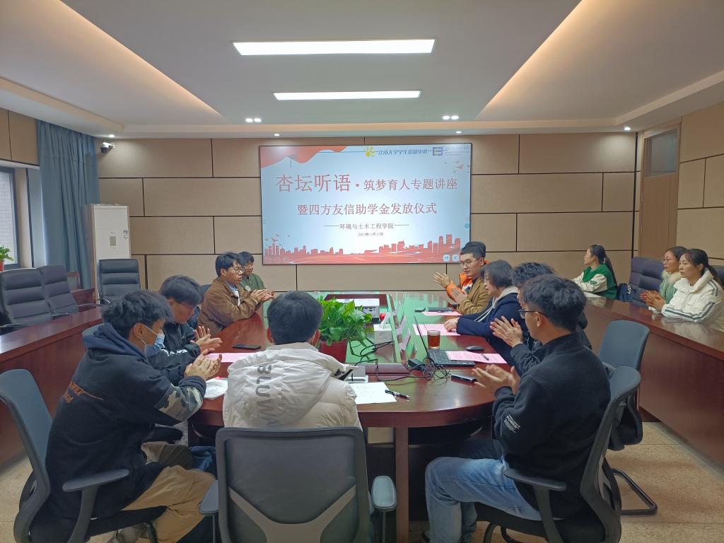 3月17日下午,环境与土木工程学院在D305举行四方友信助学金发放仪式暨杏坛听语·筑梦育人专题讲座,环境与土木工程学院党委副书记、副院长胡娟,环境与土木工程学院辅导员何涛、李东辉出席,部分四方友信助学金受助学生现场参会,会议由薛羚伟主持。