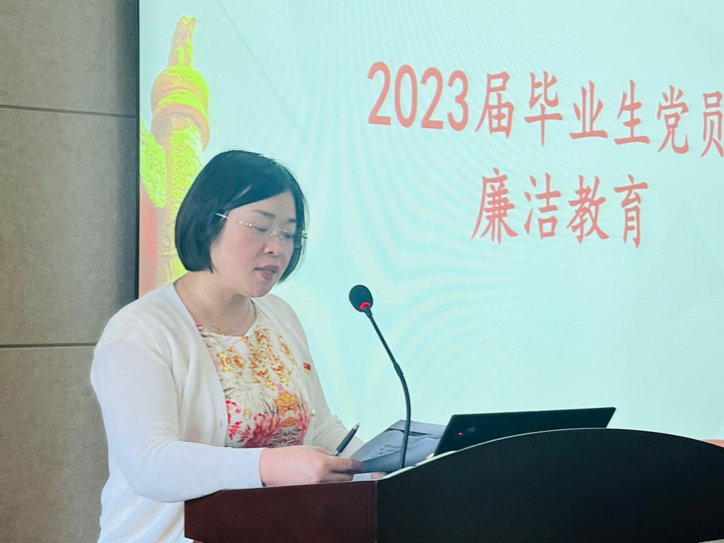 胡娟表达了对毕业生党员的美好希冀和祝愿,阐述开展廉洁专题教育对毕业生党员的重要意义。她表示毕业生党员要守好廉洁自律底线,抵制各种腐败诱惑,走好迈入社会的第一步,要扣好人生的“第一粒扣子”,做一个堂堂正正、遵纪守法的优秀青年。接着她从“时刻牢记共产党员的第一身份、严格遵守党员的根本行为规范、始终守住党纪党规的基本底线”三个方面对大家提出了具体要求,希望大家牢记党员身份,不忘初心。