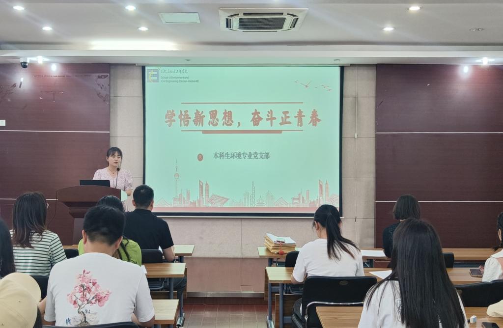 6月1日,环境与土木工程学院本科生环境专业党支部在D303会议室组织开展了“学悟新思想,奋斗正青春”本科生党员专题教育,并召开了2023上半年党员发展会议。环境与土木工程学院党委副书记兼副院长胡娟、本科生环境专业党支部书记周佳赟、支部委员李东辉以及支部全体党员参加会议。会议由周佳赟主持。