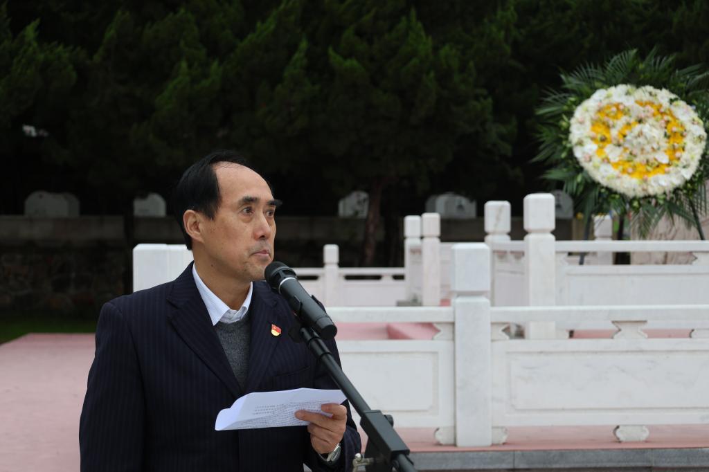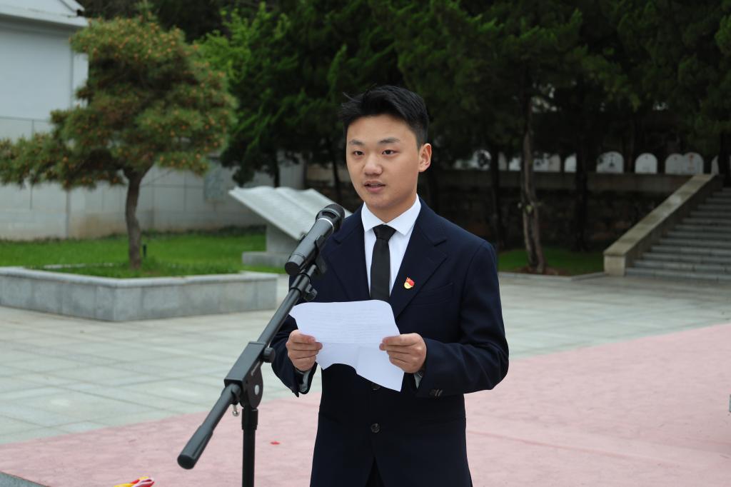 全体师生肃立,面向纪念碑默哀,而后敬献花圈,并向纪念碑三鞠躬。衡延笃作为教师代表发言,他介绍了在中国共产党的坚强领导下,中国人民为了和平做出的艰苦卓绝的努力,号召全体师生要不忘历史、铭记责任,学习、传承先烈精神,练就过硬本领,挺膺担当。学生党员代表朱光辉紧接着发言,他表示新时代的青年要继承先烈遗志,继往开来,奋发向上,为实现中华民族伟大复兴而不懈奋斗。随后,薛羚伟带领全体青马班同学以及现场所有的共青团员,一起重温了入团宣誓,并希望所有青年同学永葆对祖国纯粹和清澈的爱。