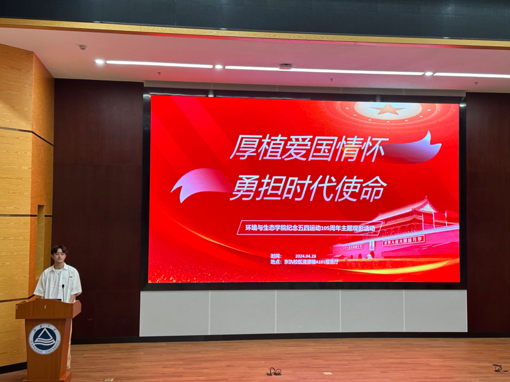 启动仪式上,环境与生态学院团委发布了“传承五四薪火 以青春奋斗姿态挺膺担当”环境与生态学院纪念五四运动105周年系列活动方案。方案包括“这盛世,如您所见”主题摄影打卡活动、“团聚青春力量”乡村振兴青春建功宣讲、“青榜样 新力量”“五四”表彰和“知行合一 守护绿水青山”暑期社会实践方案策划大赛等9个活动,涵盖了宣讲、摄影、主题教育和社会实践等多种形式。启动仪式结束后,现场青年学生一起观看了电影《无问西东》,希望青年学子以观看电影的方式重温红色历史,传承红色基因,赓续红色血脉。