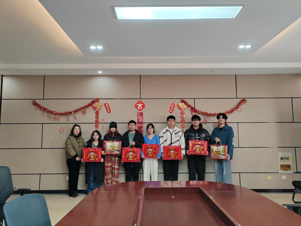胡娟向全体同学致以新春的问候,她与同学们亲切交流,关心同学们的留校生活情况,悉心询问他们的学习安排、家庭状况,鼓励他们持续保持对学习的热情,精心规划时间管理,叮嘱他们要与父母亲人、研究生导师、辅导员多联系多交流,时刻树立安全意识,要遵守学校各项规章制度,遇到困难和问题要第一时间联系学院老师。留校学生也结合自己的科研、实习实践、学习生活情况与老师们进行交流。最后,胡娟代表学院向同学们赠送了新春大礼包,祝福同学们在新的一年蛇来运转,巳巳如意。