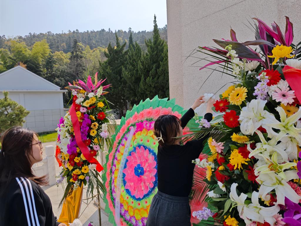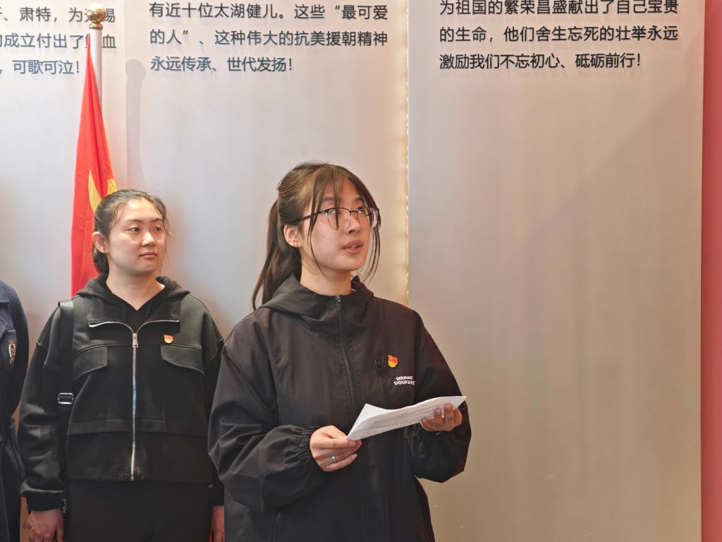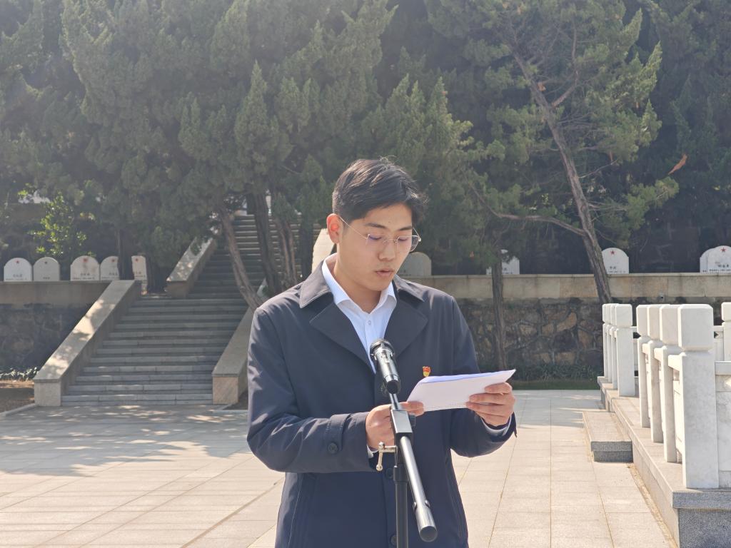 衡延笃作为教师代表发言,他讲述了父亲一辈抗战的经历,介绍了发生在无锡的重要事件;他强调,伟大的抗战精神已经传递到青年一代手中,作为新时代的大学生,要在追求知识的道路上,以英烈为榜样,树立远大理想,将个人的成长与国家的命运紧密相连。学生党员代表陈云帆用“铭记、传承、担当”三个关键词分享了自己的感悟。入党积极分子章涵表示要以本次祭扫活动为契机,铭记英烈志,以科学之光照亮未来,在建设美丽中国的征途上,让红色基因与绿色使命交相辉映。