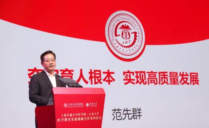 范先群对无锡市和江南大学表示感谢。他指出,江南大学作为教育部直属、国家“211工程”重点建设高校和“双一流”建设高校,办学历史悠久,在2024年“软科世界一流学科排名”中,“食品科学与工程”学科连续六年蝉联世界第一,“纺织科学与工程”学科排名世界第二,“生物工程”学科排名世界第三,农业科学排名世界前1‱,值得我们学习。近年来在市校共建的推动下,江南大学医学学科也发展迅猛。此次与江南大学的合作,标志着两校在医学领域的合作迈入了一个崭新的阶段。双方将以此次签约为起点,主动对接国家大健康战略需求,深化食品科学、生物工程与医学学科的交叉融合,围绕人才培养、学科建设、科研创新等多个方面展开全方位、多层次的深度合作,共同培养出更多高水平拔尖医学创新人才,为服务长三角一体化高质量发展和健康中国建设注入新的活力,做出双方的贡献。