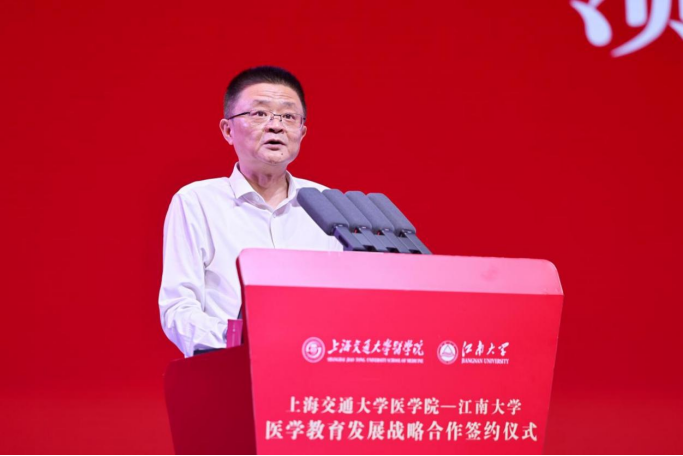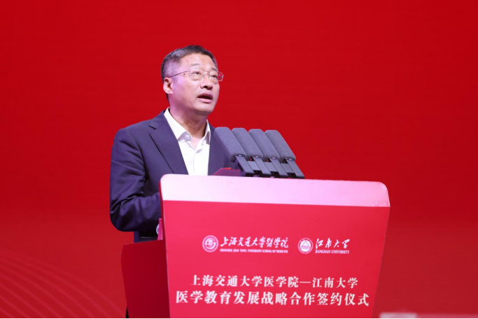 陈卫对上海交通大学医学院、无锡市委市政府长期以来给予江南大学的关心和帮助表示衷心的感谢。他指出,上海交通大学医学院是中国顶尖的医学院校之一,学科实力、科研水平、临床资源以及国际影响力均处于全国领先地位。两校前期已有多次互动和交流,此次签约是双方合作新的里程碑。未来,希望能与交大医学院携手共进,通过整合双方优势资源,在医学人才培养、附属医院建设以及大健康产业等方面开展进一步的战略合作,提升江南大学医学教育教学水平及各附属医院整体医疗水平,共同推动国家医学教育与医疗卫生事业的高质量发展。