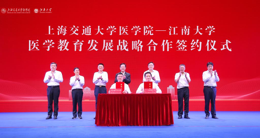 会上,马鑫从提升医学管理能力、完善人才培养体系、支持附属医院发展、加强师资队伍建设、提升学科科研实力五个方面介绍了双方医学教育发展战略合作情况。吴正一、马鑫签署上海交通大学医学院—江南大学医学教育发展战略合作协议,双方及无锡市领导见证签约。双方主要领导及相关部门负责人共同启动江南大学临床医学卓越医师交医班建设。