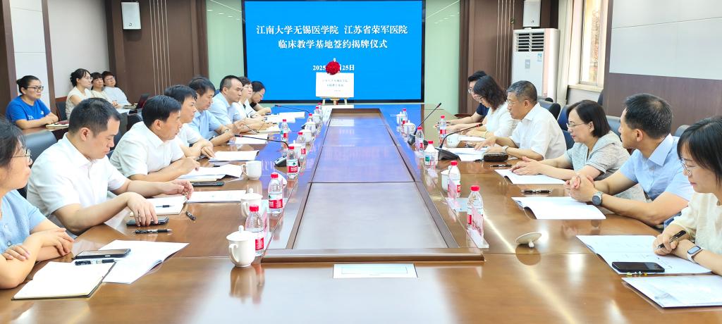 7月25日上午,我校与江苏省荣军医院举行临床教学基地签约仪式,标志着江苏省荣军医院正式成为江南大学无锡医学院实践教学基地。中国工程院院士、江南大学校长陈卫;省退役军人事务厅党组成员、副厅长刘军,优抚处处长罗新文;无锡医学院党委书记向琪、副院长代卉;省荣军医院党委书记牛玉富、院长李佟;市卫生健康委科教处处长孙道崎等出席活动。会议由牛玉富主持。