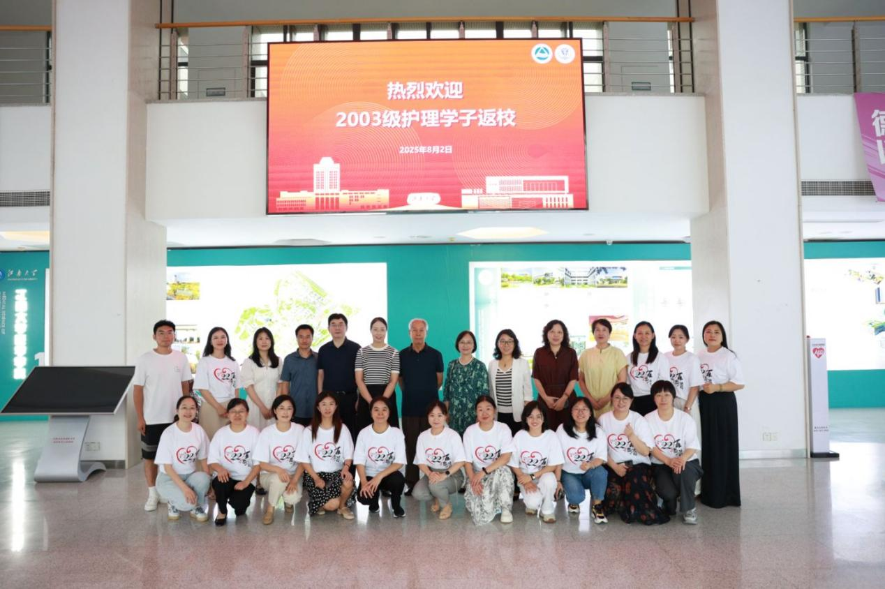 白衣执甲再聚首,薪火相传忆师恩。2025年8月2日,江南大学无锡医学院迎来了一场跨越二十余载的温情相聚—— 2003级护理专业校友从全国各地重返母校,再续同窗情谊,共忆青葱岁月,共同见证医学院的发展变迁。无锡医学院党委书记向琪、原无锡医学院党委书记邱洪良、食品学院党委书记傅莉莉、无锡医学院副院长代卉、护理系主任蒋玉宇等热情接待了校友。