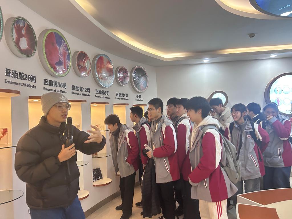 活动伊始,学院院长助理王小英老师热情接待了研学师生,并带领大家参观了医学院。王老师从学院的发展沿革、“市校共建”机制的独特优势、雄厚的师资力量以及丰富的附属医院资源等方面,系统介绍了无锡医学院的整体概况与办学特色。随后,她重点解读了学院“卓越医师创新班”的培养理念、课程特色与招生政策,引发了在场同学的浓厚兴趣与热烈提问,现场互动气氛活跃。紧接着,同学们在老师的引导下走进了充满探索意义的人体科学馆。馆内丰富的标本、精细的模型与前沿的数字化展示,将书本上的理论知识转化为直观而立体的认知,让同学们在惊叹于生命奥秘与人体结构之精妙的同时,也深刻感受到了医学的严谨与崇高。