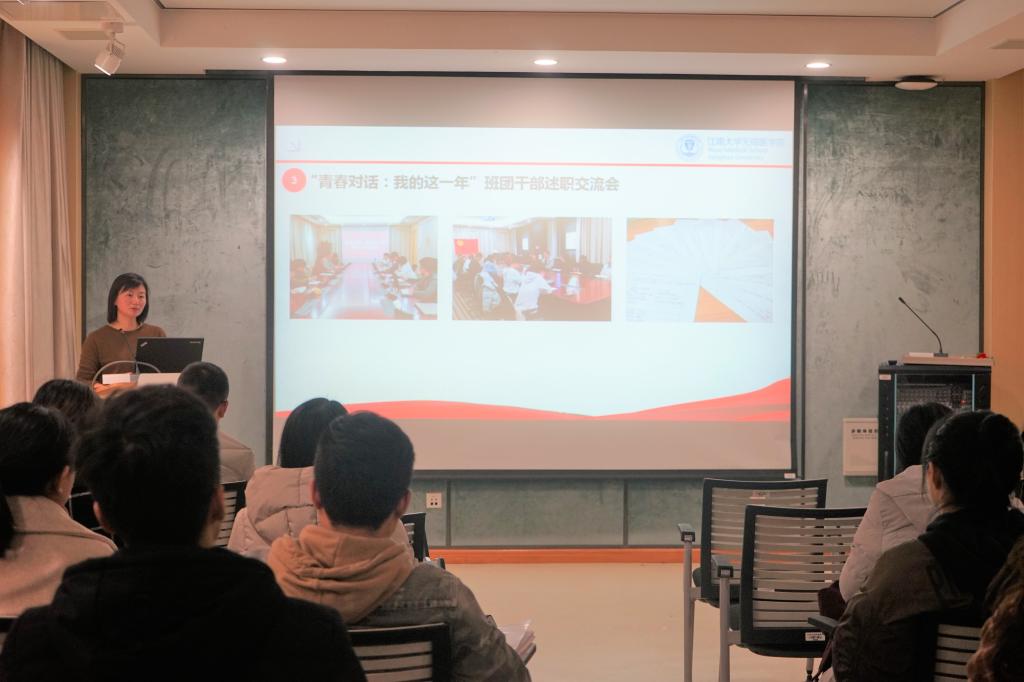 本次会议分为三个议程。首先,林丹向全体班团干部汇报了学院2018年度主题教育活动开展情况。从学院青马工程组织情况、四进四信开展情况、信仰公开课组织情况、基层组织建设、班团一体化建设、典型选树以及特色创新等七个方面进行了展示和分享。她提到虽然医学院团员青年少,团学工作起步晚,但医学院广大团员青年朝气蓬勃、奋发进取,让医学院的团学工作能够快速地发展。学院2018年荣获“无锡市五四红旗分团委”单位,既是对班团干部工作的认可,同时也是一种激励。