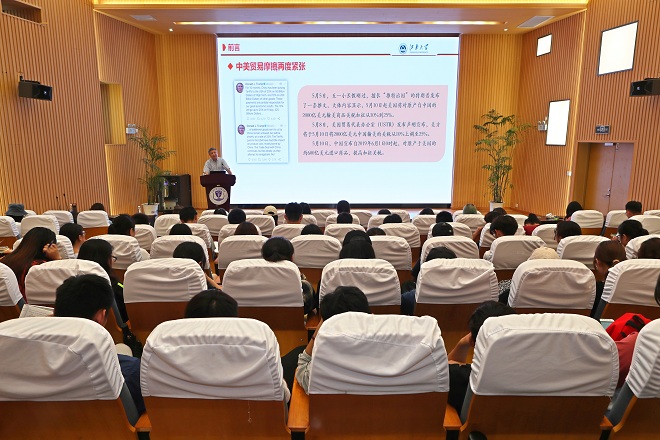 徐岩以“笃学尚行,奋发有为,成就更好的自己”为主题进行全国教育大会精神宣讲。他首先从近期中美再度紧张的贸易摩擦事件出发,带领同学们一同回顾“中美贸易战”,比较美国对中国加征关税和中国对美终止减税领域的同与不同,剖析“中美贸易战”的实质和根本原因。他指出,综合国力的竞争,归根结底是科技、人才和教育的竞争;我国的教育将强未强,还处在加快实现现代化、建设高等教育强国的关键时期。他由此指出了高等教育的重要作用,召开全国教育大会的深刻意义,并从会议召开的背景、主要内容、我校的人才培养探索、大学生如何成就更好的自己等四个部分进行了主要解读。