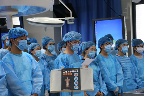 随后在赵鹏的带领下,全体学生进行了解剖学宣誓:“无言良师,授吾医理;敬若先贤,临如活体;正心恭行,追深辨细;德彰术精,修成大医”。宣誓完毕,陈永泉院长宣布正式开课,并寄语医学生不仅要掌握好医学理论知识,了解生命观和医学特殊性,更要从大体老师的奉献精神中,提高自身人文素质,培养吃苦耐劳、虚心学习、不断进步、积累经验的精神。
