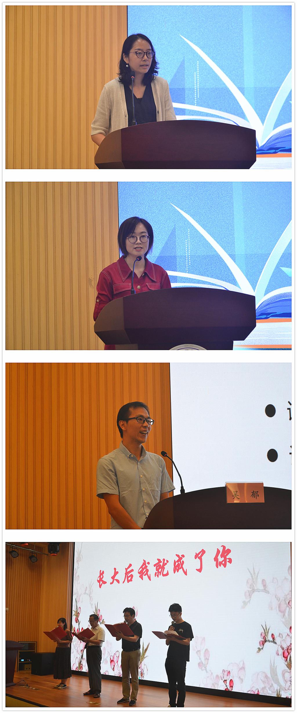 医学院胡静老师和附属院康丝丝老师分别作为获奖教师代表发言,他们深情回顾走上三尺讲台以来的点点滴滴,表达了对医学院、附属医院的真挚感情和良好祝愿。接下来,省本科高校青年教师教学竞赛一等奖获得者吴郁老师做了授课风采展示。医学院师徒四代的邬敏辰、邓超、林丹、王少和老师作诗朗诵《长大后我就成了你》,深情演绎了什么是博爱、仁心、传承的精神,将庆祝大会推向高潮。