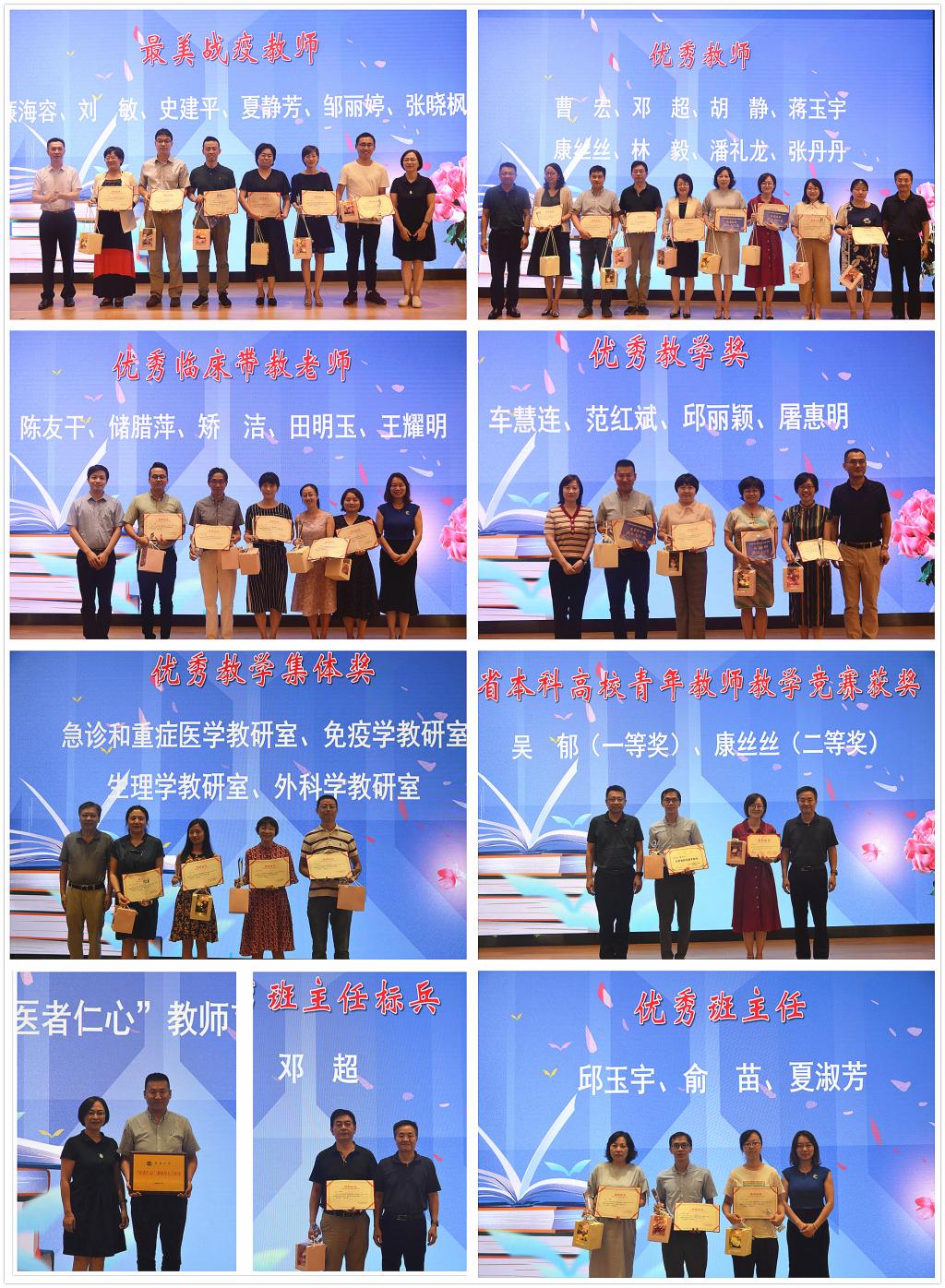 随后,医学院院长陈永泉宣读了《2020年江南大学无锡医学院/附属医院教师节庆祝大会表彰名单》。学院表彰了2019-2020年度最美战役教师6名、优秀教师8名、优秀临床带教老师5名、优秀教学奖4名和优秀教学集体4个、省本科高校青年教师教学竞赛获奖教师2名、“医者仁心”教师育人工作室1个、优秀班主任标兵1名、优秀班主任3名。与会领导向获奖老师和集体颁发证书并合影。