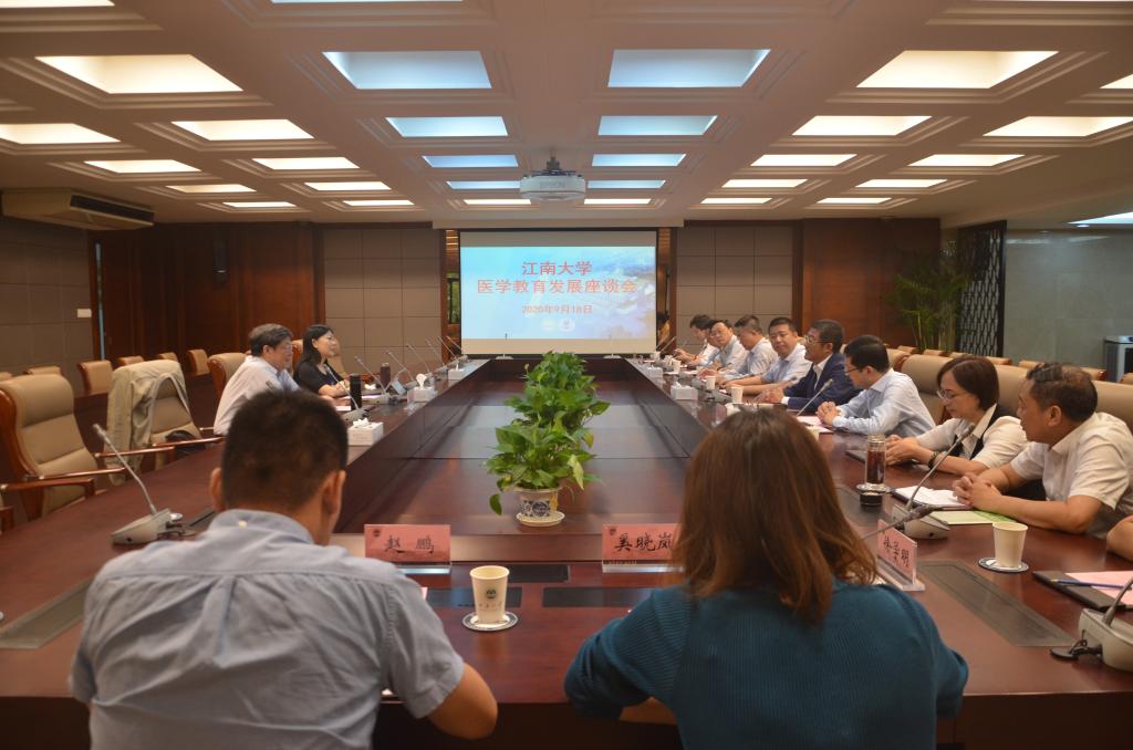 9月18日上午,江南大学医学教育发展座谈会在行政楼B305会议室召开。首都医科大学原校长、教育部院校审核评估专家、临床医学专业认证专家吕兆丰教授和首都医科大学全科学院书记、教育部高等学校审核评估专家、教育部临床医学专业认证专家付丽教授应邀参会。江南大学校长陈卫、副校长张凌浩、无锡市卫生健康委员会副主任杨如年、江南大学校长办公室主任兼市校共建合作办公室主任张梁、人力资源处处长王鸿博、教务处处长徐学明、医学院党委书记向琪、附属医院党委书记周小金、医学院院长陈永泉,医学院党委副书记、副院长奚晓岚,医学院副院长兼教务处副处长、附属医院副院长赵鹏,医学院副院长兼科学技术研究院副院长马鑫参加了会议。会议由张凌浩主持。