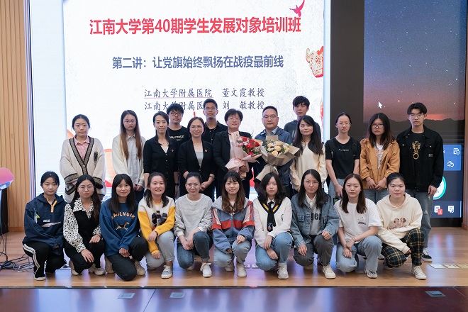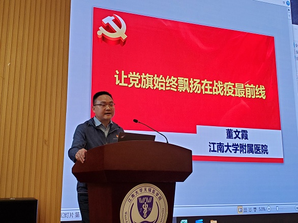 10月11日下午,江南大学医学院第40期分党校课程之“让党旗始终飘扬在战疫最前线”在医学院C101报告厅开讲。主讲嘉宾是江南大学附属医院援鄂医疗队队长、省卫健委疫情防控“记功”奖励获得者董文霞教授和江南大学附属医院援鄂医疗队核心队员、省卫健委疫情防控“记功”奖励获得者刘敏教授。江南大学医学院、食品学院、生工学院、化工学院、药学院、北美学院等六个学院158名发展对象参加此次专题党课培训。