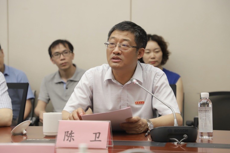 陈卫发表讲话,他首先对市校共建医学院专班成立以来推进频率高、力度大、效果强表示认可,同时也对医学院近几年在人才培养、学科建设、师资队伍等方面取得的成果表示肯定。针对下一步工作,陈卫强调,一是要加快临床医学一级博士点的建设。博士点的建设对高层次人才的培养和引进、医学学科的建设和发展以及临床实力的助推和提升起着至关重要的作用;二是加快推进师资队伍建设。一方面要加大力度引进高层次人才,另一方面要整合无锡医疗资源,用好区域高峰高原人才;三是医学院要高起点、高标准制定发展规划。通过市校共建机制推进医学科研大楼和高水平动物中心的建设。