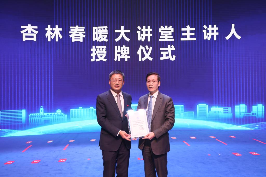 随后,陈国强以《扛起使命逐梦医学》为题作大会报告。他详细阐述了上海交通大学医学院的办学历程,从“守正改革和制度建设永远在路上”“没有爱就没有教育”“文化建设是内涵建设的灵魂”三个方面详细介绍了医学办学定位、办学理念和人才培养目标,并与在场师生亲切互动交流。这场有情怀、有思想、有深度的报告打动在场的全体师生,也为我校医学学科高质量发展指明了方向。报告前,陈卫为陈国强颁发了杏林春暖大讲堂主讲人证书。