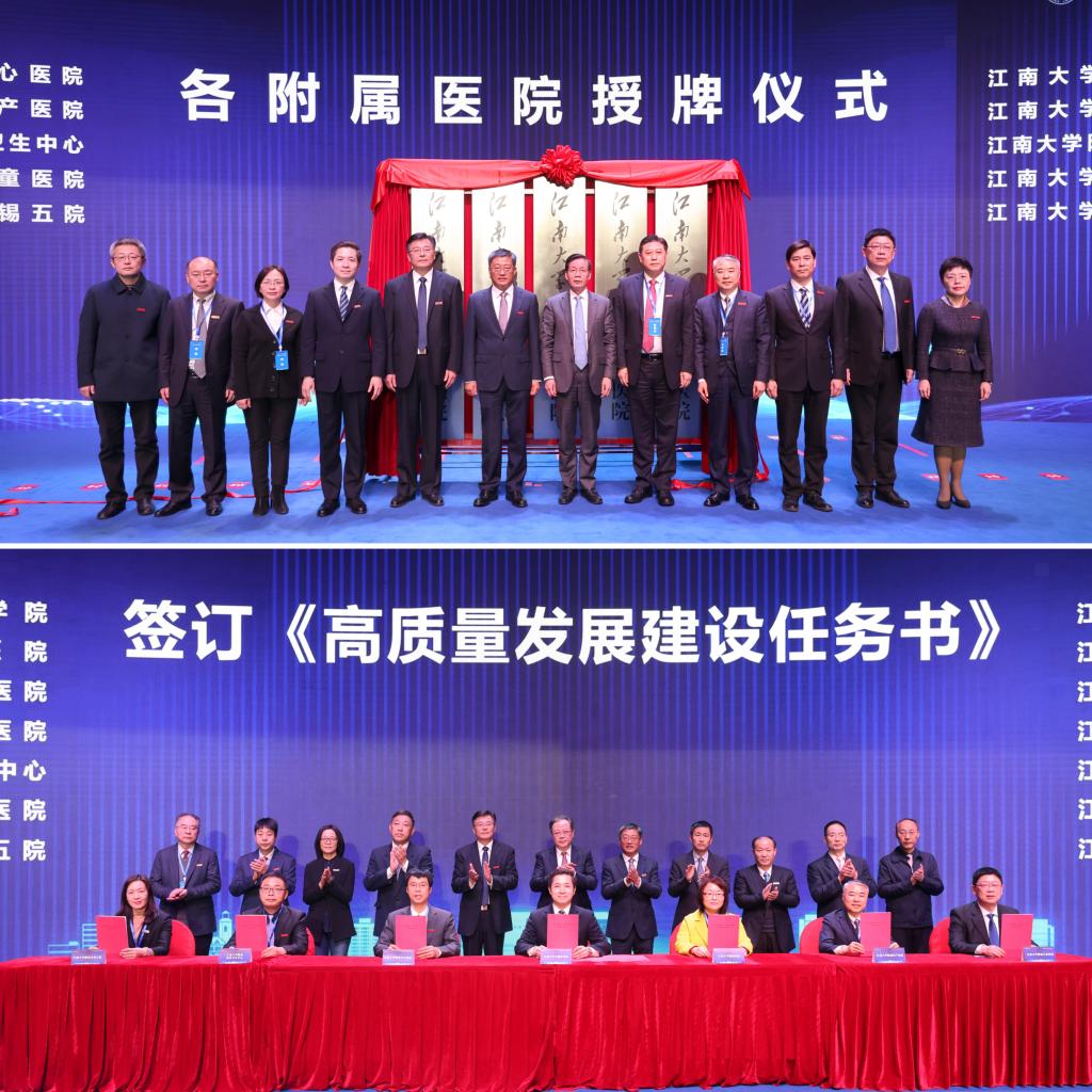 会上,江南大学校长陈卫、陈国强、江南大学党委副书记符惠明等共同为各附属医院授牌。马鑫和各附属医院领导签订《高质量发展建设任务书》,全体校领导见签。任务书的签订既是目标和责任的共担,更是信念和使命的传递,对全面提高无锡地区医疗卫生事业和江南大学医学学科内涵建设具有深远意义。