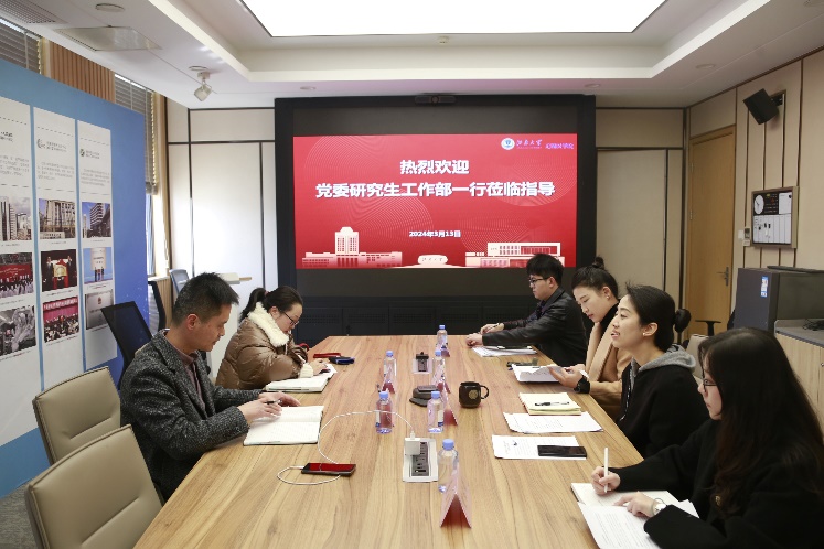 3月13日下午,校党委研究生工作部副部长、研究生院副院长陈周,研究生工作部正科级干部汪洁一行赴无锡医学院调研指导研究生思想政治教育和日常管理工作,无锡医学院党委副书记、副院长包羽,学工办主任兼分团委书记胡晓丹,以及研究生辅导员董宝莹、杨宇参加会议。