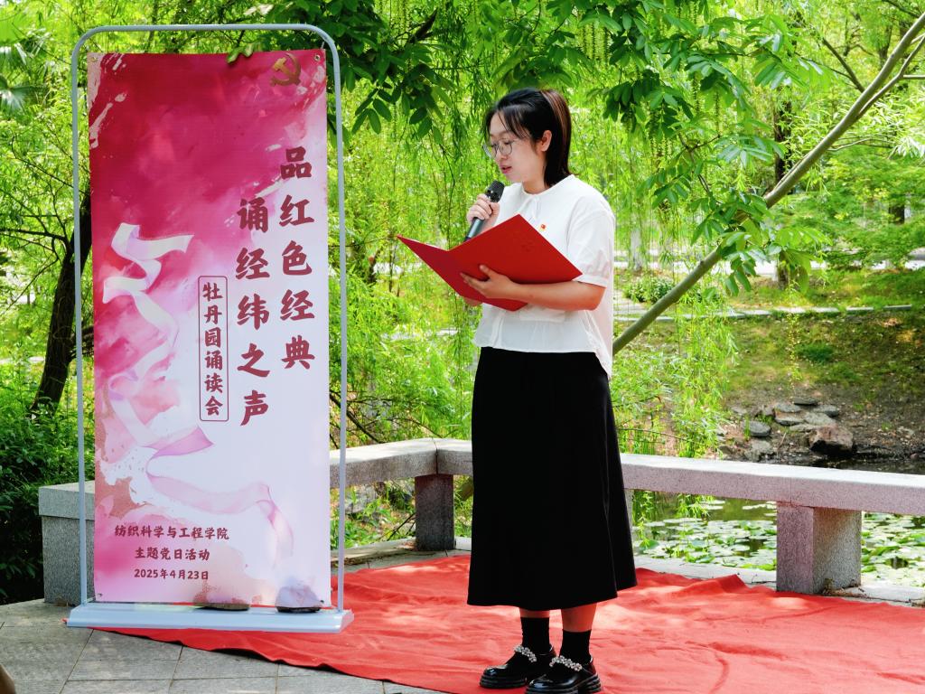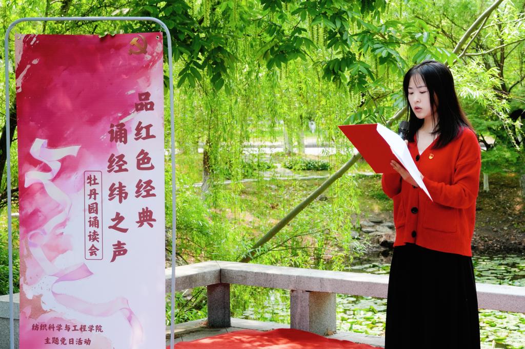 科研路上赤子心,经典引航铸党魂,4月23日下午,纺织科学与工程学院举办“品红色经典 诵经纬之声”牡丹园诵读会,学院各硕、博士党支部的30位党员代表参与活动。