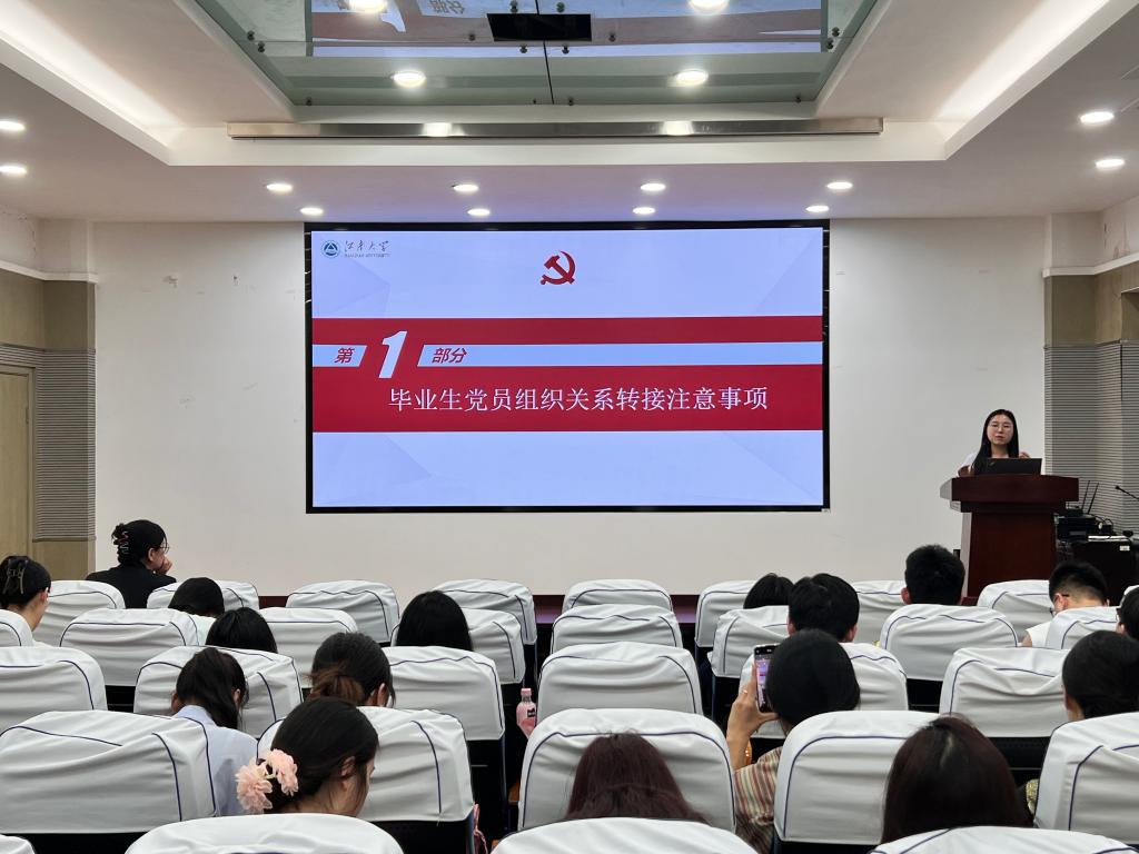 杨莉勤带领全体师生党员面对庄严的党旗重温入党誓词,勉励毕业生党员以誓词为镜,时刻校准思想坐标,在工作岗位上争做廉洁表率,以实际行动擦亮党员“金名片”。孙婷婷就毕业生党员的组织关系转移、党员档案转接等相关事项进行了详细说明,让毕业生党员清楚地了解了党组织关系的转接流程,进一步帮助毕业生党员提高思想认识,解决实际问题。