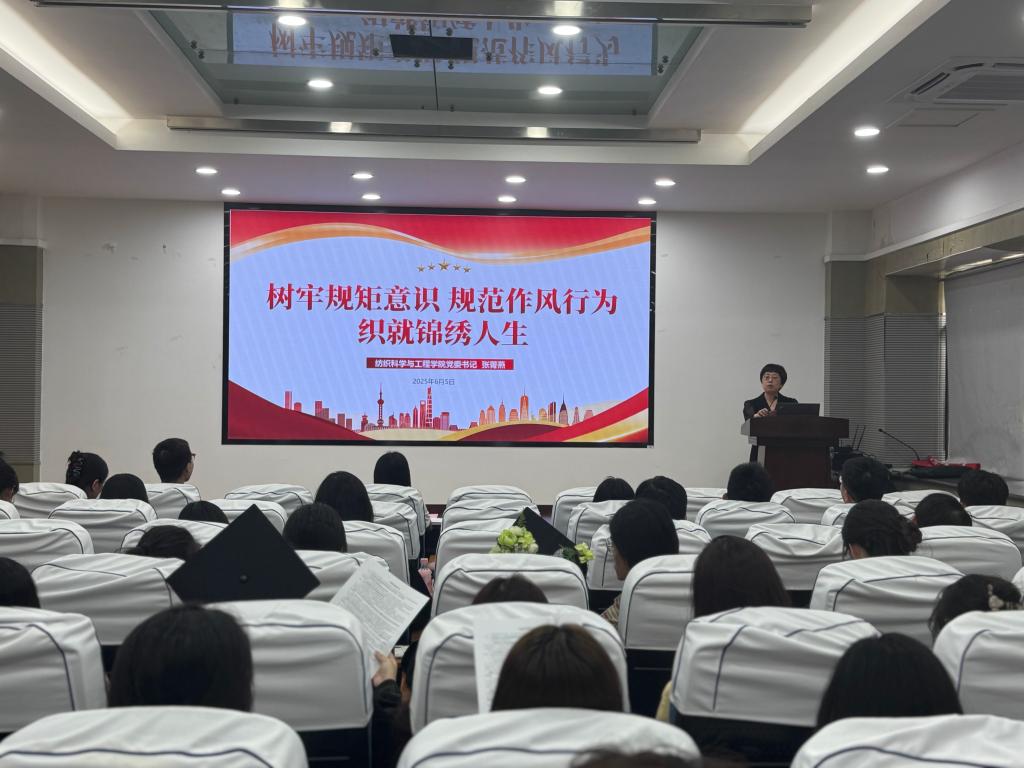 为扎实开展深入贯彻中央八项规定精神学习教育,引导毕业生增强廉洁自律意识,筑牢廉洁从业纺织科学与工程学院党委举办2025届毕业生党员集中教育暨组织关系转移培训会思想防线,扣好走向社会的“第一粒扣子”,6月5日下午,纺织科学与工程学院在A103会议室举办2025届毕业生党员集中教育暨组织关系转移培训会。学院党委书记张菁燕,党委副书记、副院长杨莉勤,学工办主任、2025届研究生辅导员任学敏,2025届本科生辅导员张旭,党建辅导员孙婷婷和全体毕业生党员参加会议。会议由张旭主持。