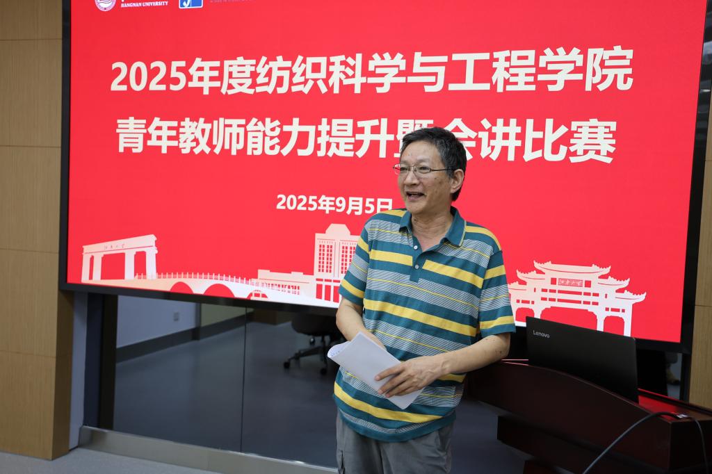 9月5日下午,纺织科学与工程学院2025年度青年教师能力提升暨会讲比赛在学院A306会议室成功举办。本次活动既是学院迎接教师节的重要教学实践活动,更是助力青年教师提升教学能力、以赛促教的重要平台。学院党委书记张菁燕、轻化工程系主任殷允杰莅临指导,王树根教授、徐阳教授、王平教授、袁久刚教授、李蔚副教授担任评委,关玉、贺海军、李大伟、孟超然、周曼五位青年教师同台竞技,学院38岁以下青年教师到场观摩参会。