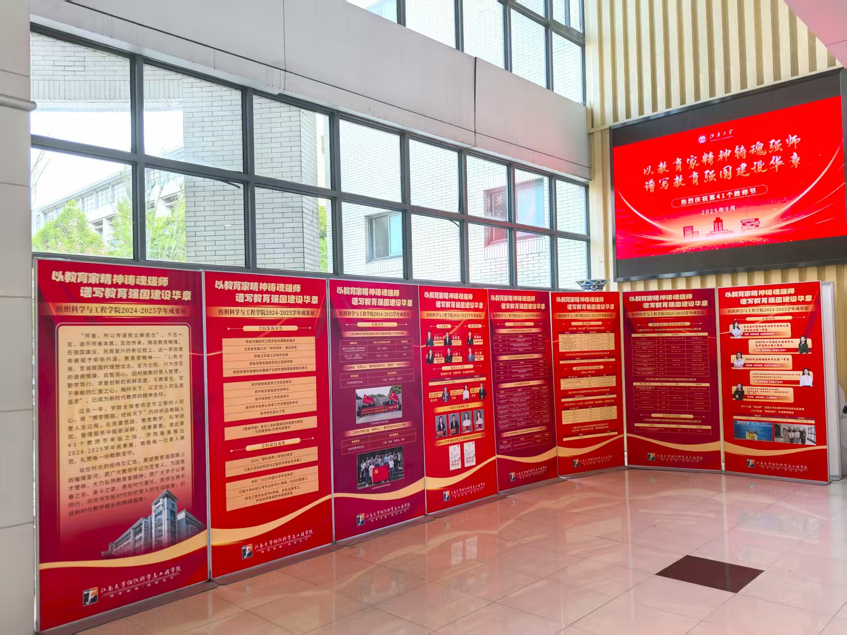 硕果盈枝,笃行精进谱华章。过去一年,学院全体老师坚守立德树人初心,将“博学慎独、经纶天下”的纺织品格融入育人全过程,在党建思政、教育教学、科学研究、管理服务中砥砺深耕、硕果累累。值教师节之际,学院在大厅隆重推出2024-2025学年成果展,致敬每一位育人典范,礼赞每一份默默坚守。