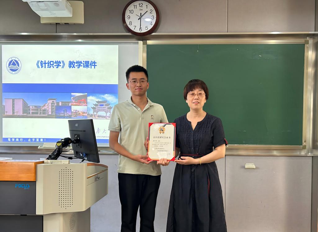 此次获授纪念证书的薛有松老师于2025年1月入职纺织科学与工程学院,经过半年的岗前培训与教学准备,9月份首次为纺织2303班讲授《针织学》课程。颁发仪式上,张菁燕介绍了薛老师的学习经历和在读博期间取得的成绩,她希望薛老师能将自身扎实的学术基础和创新思维带入课堂,为学院的教学工作注入新的活力。同时,她也鼓励薛老师在今后的教学道路上不断探索,积极践行“教学相长”理念,持续提升教学质量,成为深受学生喜爱和尊敬的“四有好老师”。