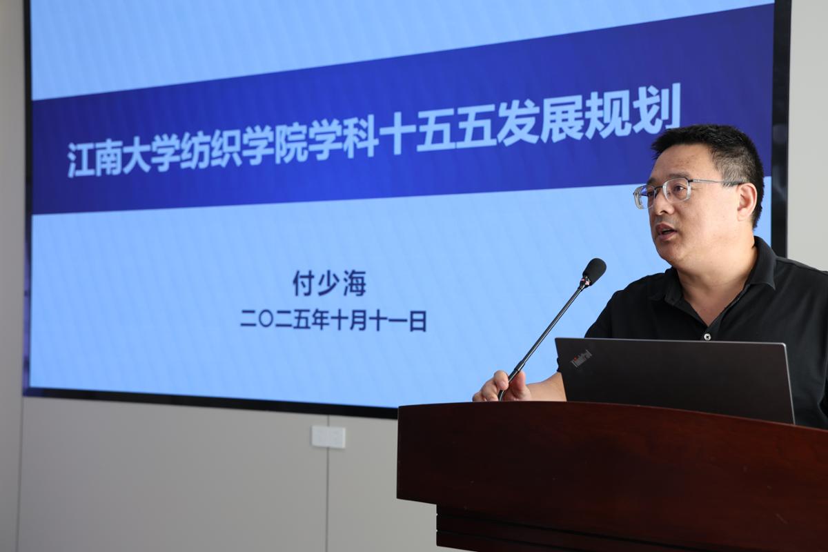 付少海作学院“十五五”规划(2026-2030)起草工作报告。他围绕学院“纺织学科‘十五五’发展规划”,总结了学院的任期目标完成情况,深入剖析了目前学院在学科平台建设、科研成果、人才引进等方面存在的问题与挑战,并结合“十五五”规划背景,提出学院“十五五”期间的总体发展目标——建成“研究型、国际有影响力、特色鲜明优势凸显”的纺织学科,并从三大维度部署具体举措:一是要围绕国家战略,凝聚学科方向。打造军工特色、智能织造技术、生态加工技术的核心学科方向;二是要坚持四个面向,开展学科研究。以平台为引领,优化科研团队,强化特色建设;三是加强师资队伍建设,优化人才培养机制。注重高水平师资队伍建设,深化高素质人才培养改革,构建“纺织+创新拔尖本科生人才培养体系”与“多维度研究生人才培养模式”,为纺织产业高质量发展输送人才。