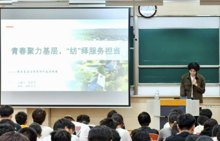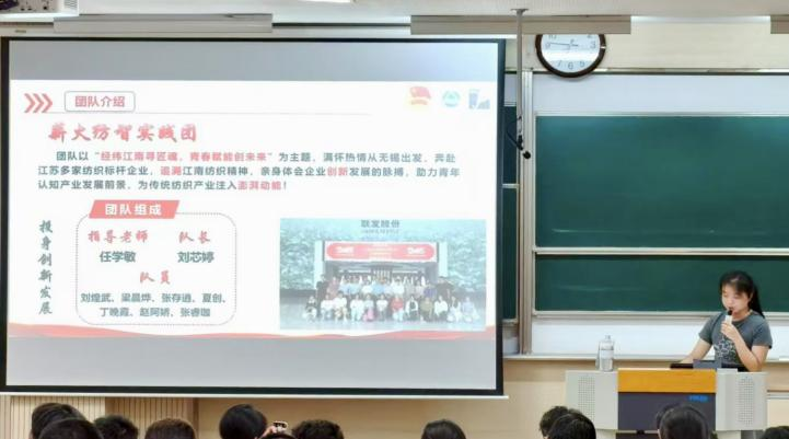 在本次暑假社会实践中,各团队围绕不同主题开展了一系列紧扣时代主题,内容丰富形式多样的社会实践活动。体悟“大思政课”,寻“纺”领袖足迹政务实践团深入基层一线,践行“三下乡”使命,在行走的“大思政课”中感悟思想伟力。薪火纺“智”实践团以“行走的思政课”为载体,深入纺织企业,于产业一线探索新质生产力。“经纬安疆,织梦固边”实践团以实地考察探寻纺织价值,用社区宣讲传播安全理念,深入挖掘纺织行业在国家安全中的重要作用。“鼋起江南,梦赴川西”实践团奔赴四川泸定,与各族孩子共同打造难忘夏令营,同时深入开展红色调研,用青春书写担当。聚力青春有为,深“纺”基层服务实践团返乡投身基层治理,为基层治理提效注入青春纺织动能。“纺工传承红色薪”传承红色基因实践团开展故事宣讲、探访红色地标、整理党史资料,用青年视角解读信仰的力量。“经纬织文脉,锦绣展自信”实践团亲历多元文化,体悟中华优秀传统文化之韵。“文心筑梦,文脉薪传”实践团探寻多地传统文化,用行动践行传承。八位实践团的团队代表依次登台分享他们的实践故事,用鲜活案例展现知行合一的青春力量。