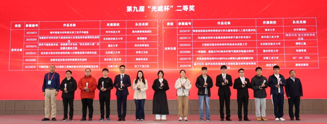 第九届“光威杯”大学生科技创新竞赛由中国复合材料学会、威海市科学技术局及威海市火炬高技术产业开发区管理委员会联合主办。大赛自启动以来,收到来自全国各院校的参赛作品共360份,通过形式审核296份,参赛作品涵盖了航天航空、新能源、人工智能、绿色低碳、智能制造、生物医药等。经初赛预选、分赛区初赛、网络投票及全国半决赛等环节,最终仅有50支队伍晋级全国决赛。经过专家评审,最终评选出本科生组一等奖2名、二等奖6名、三等奖8名,优胜奖10名;以及研究生组一等奖2名、二等奖6名、三等奖8名,优胜奖8名。