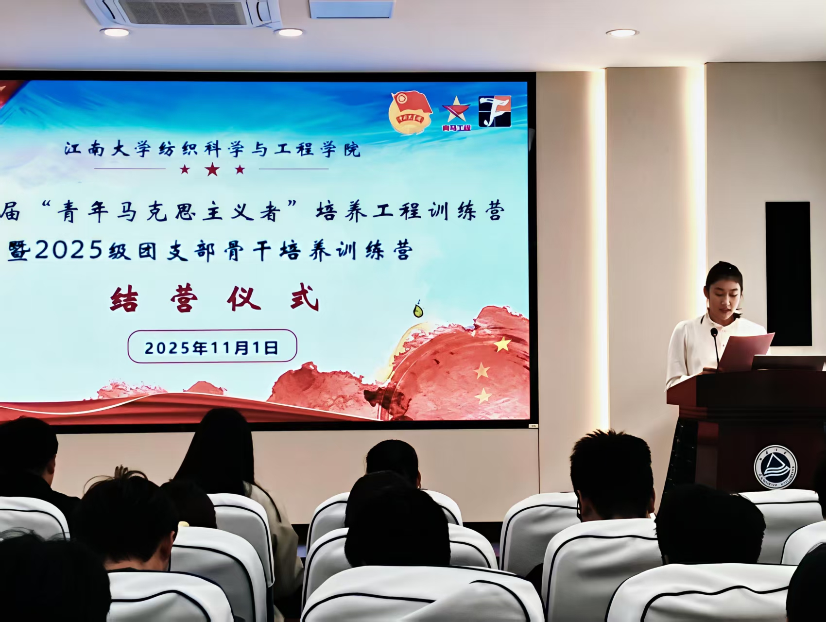 11月1日,纺织科学与工程学院第十一届“青年马克思主义者培养工程”训练营暨2025级团支部骨干工作培养训练营结营仪式在学院A103会议室顺利进行。学院学工办主任兼分团委书记任学敏、2025级本科生辅导员孙洲龙、学生会执行主席周珈宇、学生会主席团王生域,“钱之光”“张闻天”“雷锋”特称团支部团支书、训练营全体学员以及2025级本科生班团骨干参加仪式。学生会团委通讯社胡婧文淇主持活动。