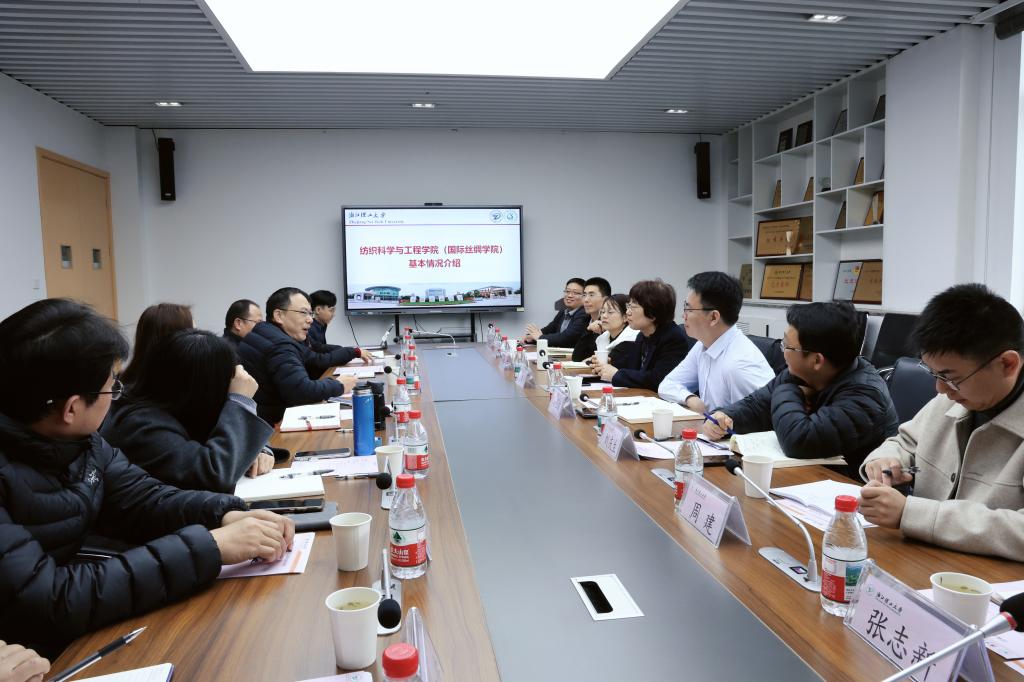 在浙江理工大学纺织学院(国际丝绸学院),学院党委书记苏淼、院长于斌携班子成员参加了座谈交流会。双方分别介绍了各自办学特色、学科优势与发展思路,围绕党建与事业发展深度融合、专业建设、课程改革、成果转化、青年教师发展等内容开展务实交流。双方坦诚沟通、深入探讨,就新时代纺织学科建设与人才培养等方面形成了广泛共识。
